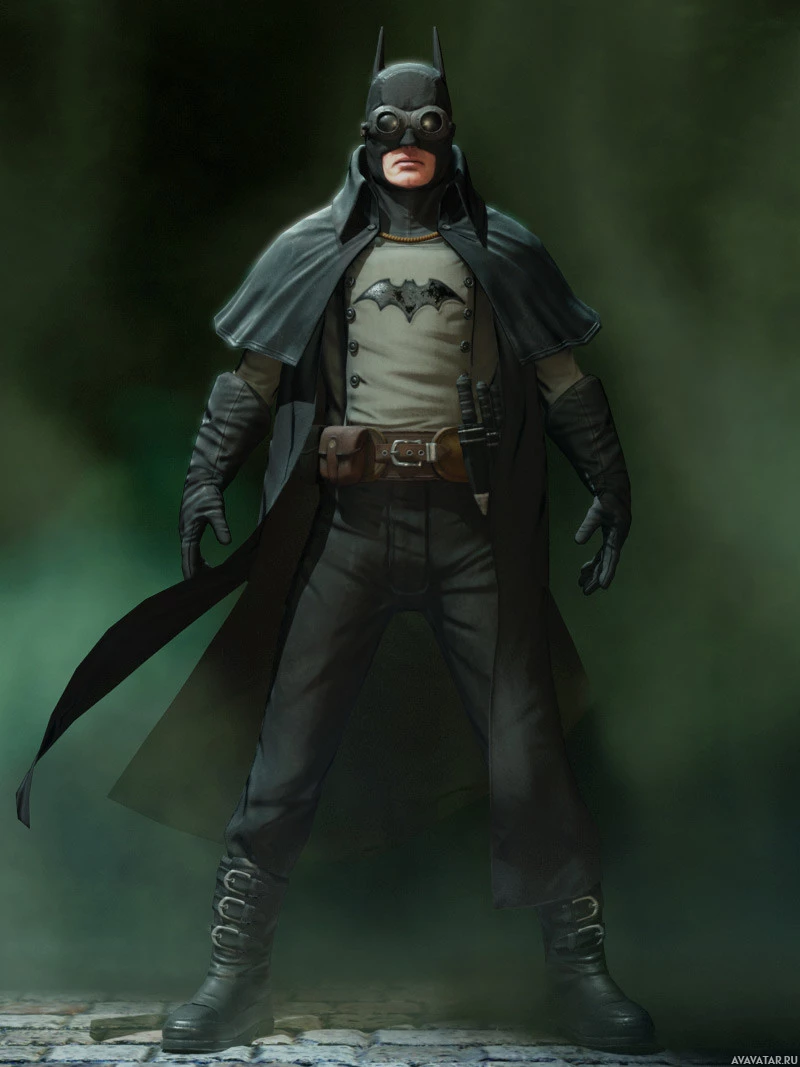 urban environment with mist or smoke. This character is wearing a cape and cowl that are more detailed than the traditional Batman costume, with elements like leather straps and what seem to be
