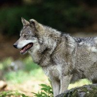 The image shows a wolf standing in what appears to be a woodland or forest setting. The wolf is looking towards the camera and has its mouth slightly open, which could suggest it's panting or communicating with humans nearby. The environment looks lush and green, indicating that it might be spring or summer.