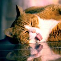 The image shows a cat lying on its back with its belly exposed. The cat's tongue is sticking out, suggesting it might be panting or perhaps just relaxed and comfortable. The reflection of the cat can be seen in a surface below it, adding an interesting