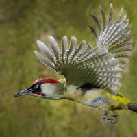 red head, white body with black speckles, and yellow markings on the wings. The bird is captured in mid-flight with its wings spread out wide, displaying its
