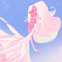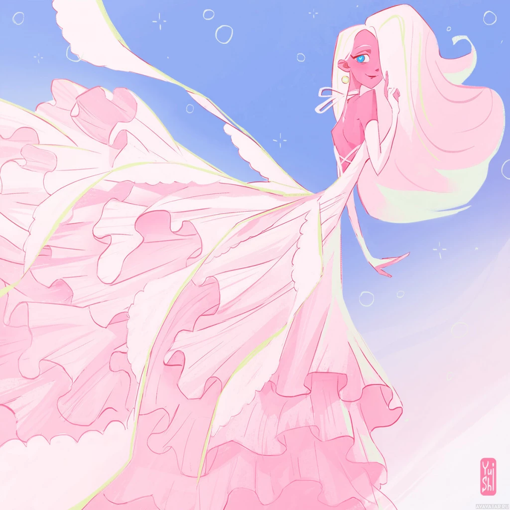 white hair wearing a long pink dress. She has her back to the viewer, and the dress appears to be flowing in the wind due to her movement. The background is a light