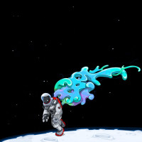 a clear visor, allowing a view of the environment. From the astronaut's back, there seems to be an artistic or perhaps whimsical touch: a long, flowing line resembling a paint brush stroke or ribbon trailing from their back towards