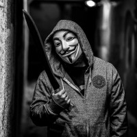 a hooded cloak, often associated with the Guy Fawkes mask from the "V for Vendetta" movie. This mask is commonly referred to as an "anonym" mask, which has become iconic and synonymous with activist movements that aim to maintain the privacy of their participants. The person is holding what appears to be a pair of scissors in one hand, suggesting