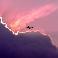 large clouds that appear to be illuminated by the sun's light. In the upper left corner of the photo, there is an airplane flying across the sky, creating a silhouette against the bright clouds. The overall composition gives a sense of peacefulness and solitude as the plane soars through