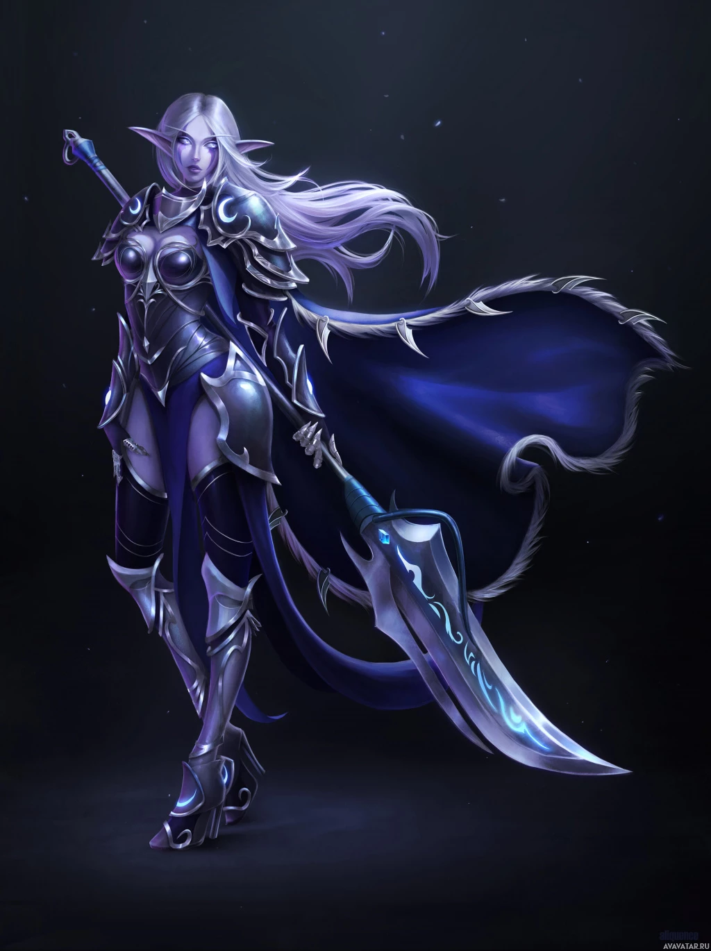 a fantasy character with white hair, standing in a dynamic pose that suggests readiness for battle. The character is wearing armor with a blend of blue and dark colors, reminiscent of the Drow race from