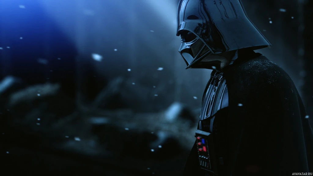 На картинке изображен персонаж, известный как Дарт Вейдер из франшизы «Звездные войны». Он изображен стоящим в снежной или ледяной среде, с характерным одеянием и шлемом. Его поза предполагает, что он может созерцать или наблюдать что-то на расстоянии.