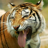 На снимке изображен тигр с открытым ртом, с зубами и языком. Похоже, что он запечатлен в момент вокализации или, возможно, игривого поведения. Тигр имеет узорчатую шерсть с полосками на лице, ушах и теле. Это типично для узоров меха, наблюдаемых у тигров, которые известны своей отличительной маркировкой.