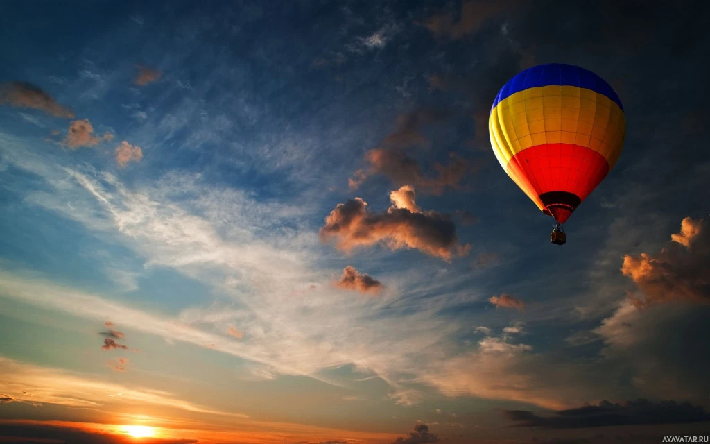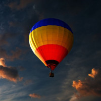 a hot air balloon flying in the sky at sunset. The balloon is adorned with stripes of red, yellow, and blue, which are typical colors for such balloons to make them easily visible against