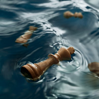 На картинке показана серия шахматных фигур, плавающих на поверхности воды. Это необычное зрелище, потому что шахматные фигуры обычно находятся на доске для игры, а не в воде. Эта сцена придает художественный или сюрреалистический оттенок знакомому объекту.
