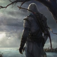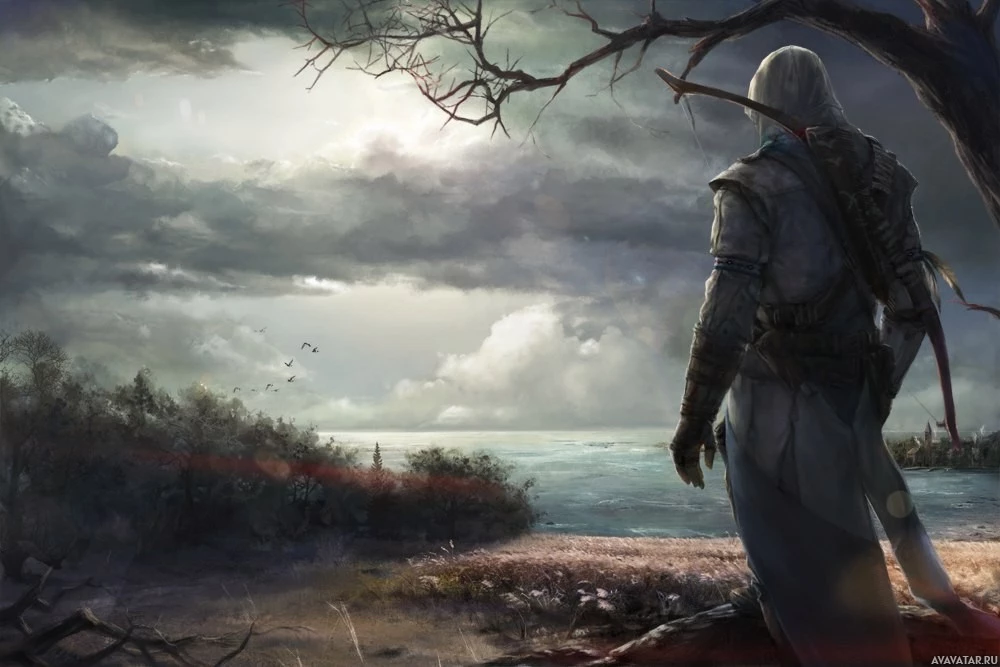 the video game "Assassin's Creed." The individual is shown from behind, standing on