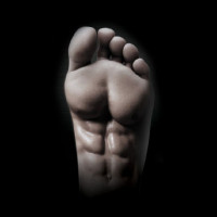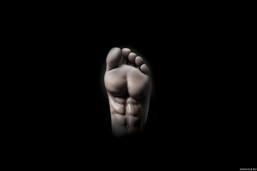 a dark background, with the foot positioned such that the sole of the foot is visible and it seems as though there's a muscular calf depicted below the foot. This creates