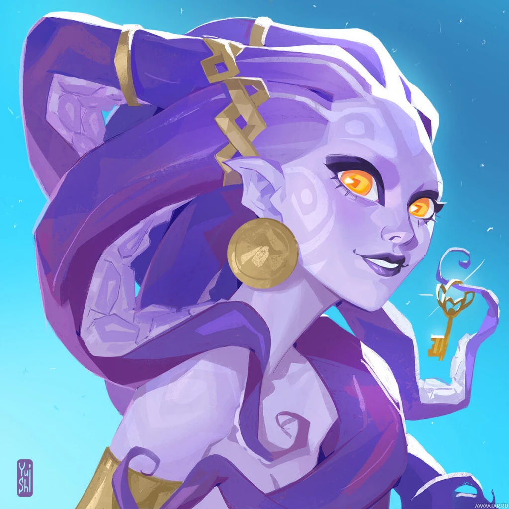 a fantasy setting or character. The background is simple, featuring a plain sky that might indicate the character's environment or their presence in a narrative scene from