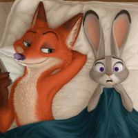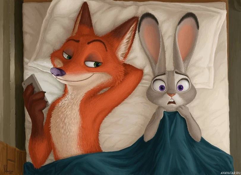 animated characters, a fox and a rabbit, lying on their backs in bed. The fox is holding a phone, suggesting they are awake or just woke up, while the rabbit appears to be surprised or reacting to something. This scene is from