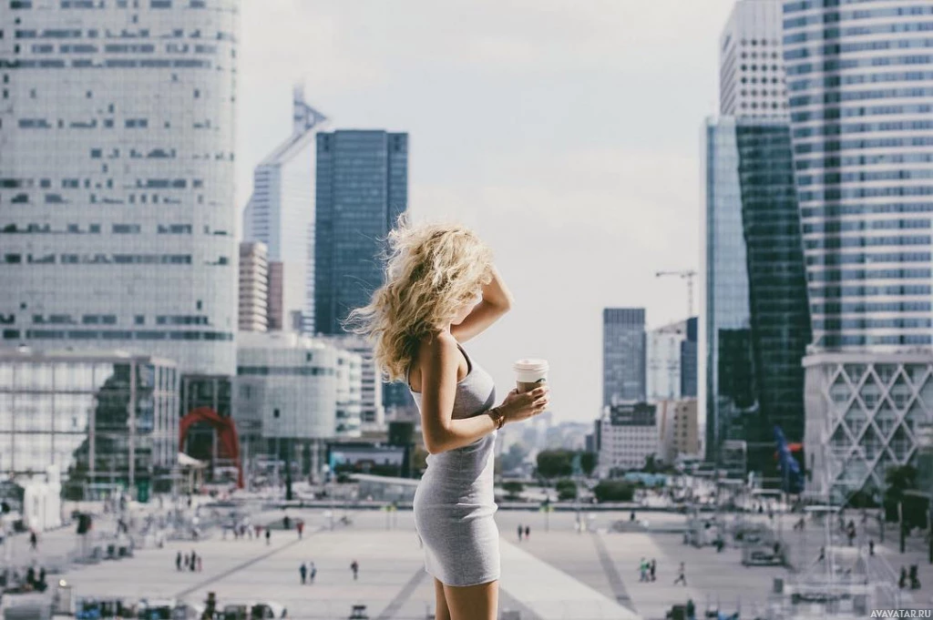 an urban environment, possibly on a rooftop or balcony overlooking a city skyline. In her hand, she holds