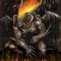 the body of a human with wings and a tail, and is adorned with fire coming out of its head and mouth, which adds to the menacing appearance. This creature embodies elements typically associated with demons in