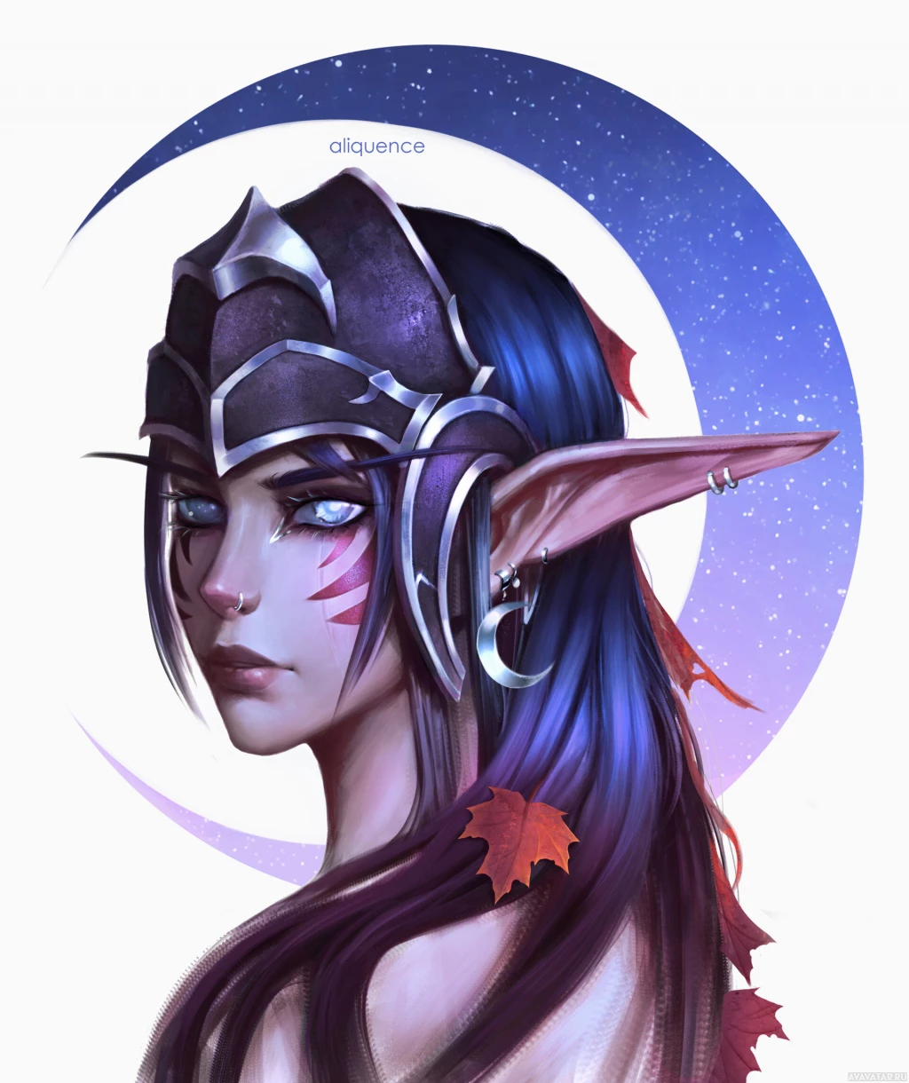 blue hair, pointed ears typical for fantasy depictions, and is wearing what appears to be a helmet or headpiece with some intricate designs. The background suggests