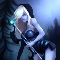 a female character dressed in dark clothing, reminiscent of the Drow Ranger from the game "Dota 2." She is holding a bow and has her hood up. Her expression is serious, and she appears to be standing in a forest-like setting with