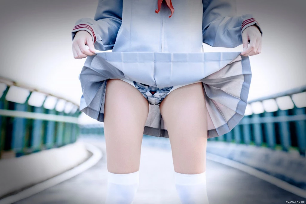 a school uniform, including a skirt and white socks. Their hands are placed near their waistband, which is pulled down in a manner that suggests the underwear might not be fully covered by the uniform's skirt. This could imply that the individual is engaging in an activity that requires flexibility or movement, such as dancing or running. The overall style of the image is somewhat distorted and filtered, giving it