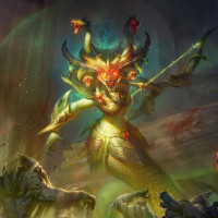 snakes for hair and a demonic appearance, wielding a trident. Surrounding Medusa are