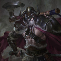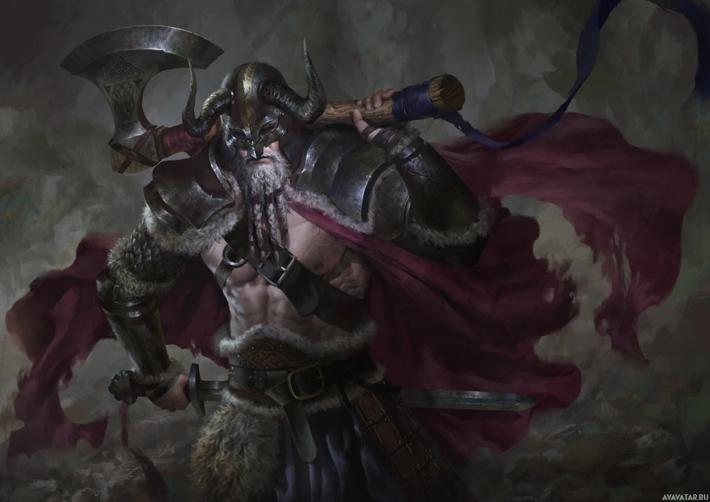 a fur cloak and a helmet with horns or decorative ears that add to the medieval or mythical appearance of the character. The background is somewhat ominous with