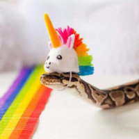 The picture shows a snake with an unicorn horn on its head. This creates a whimsical and humorous scene, combining elements of fantasy and the natural world. There is also a rainbow in the background, adding to the playful theme of the image. It's clear that this photo is intended to evoke a sense of fun and amusement.