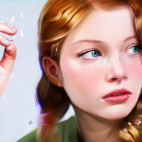 red hair, looking towards the viewer. She has light-colored eyes and is wearing makeup that includes defined eyebrows and