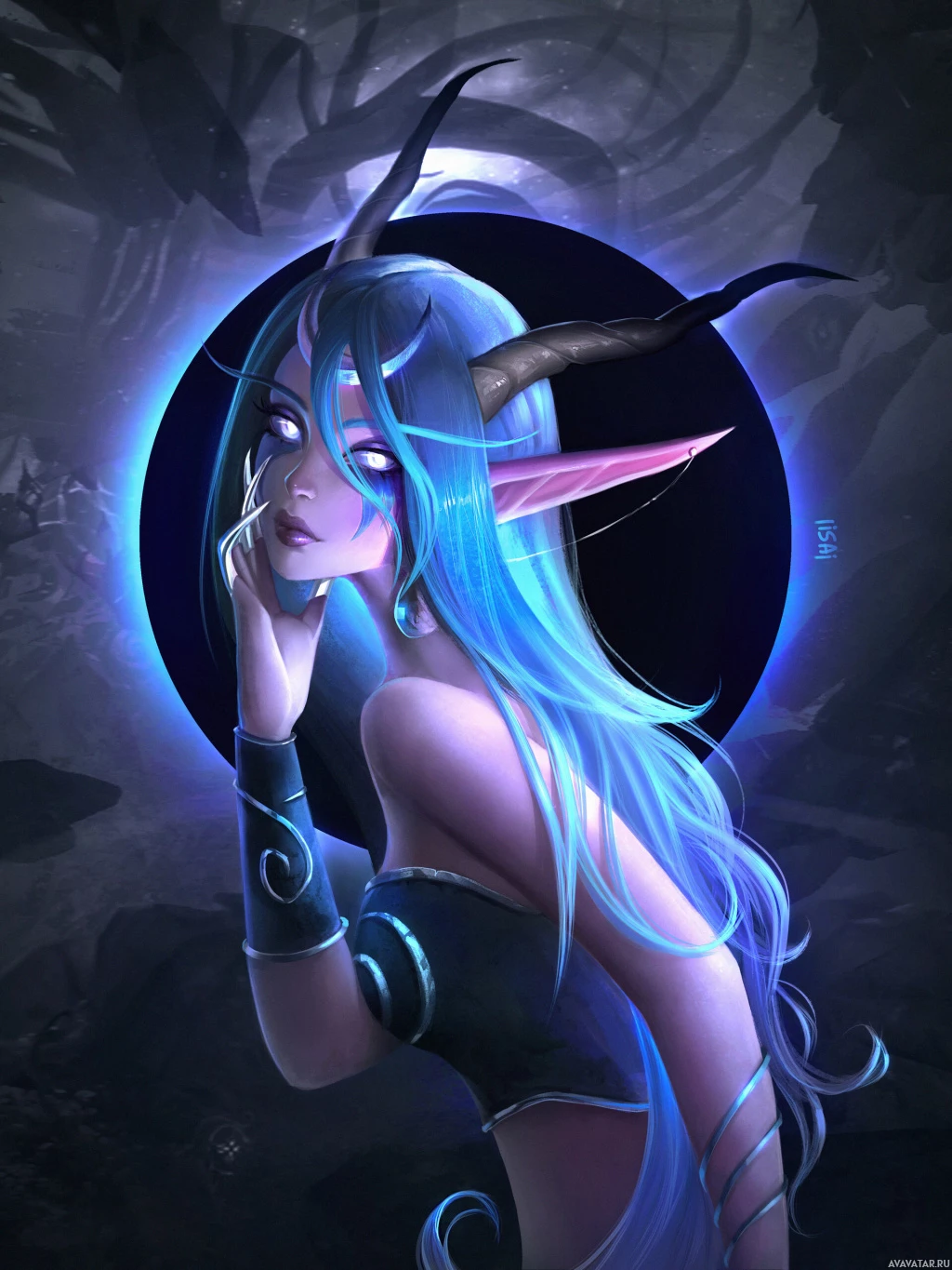 blue hair and is wearing what seems to be elven-style armor with a sword at her side, suggesting she might be a warrior or guardian type of character within the context of her story or setting. The background gives off