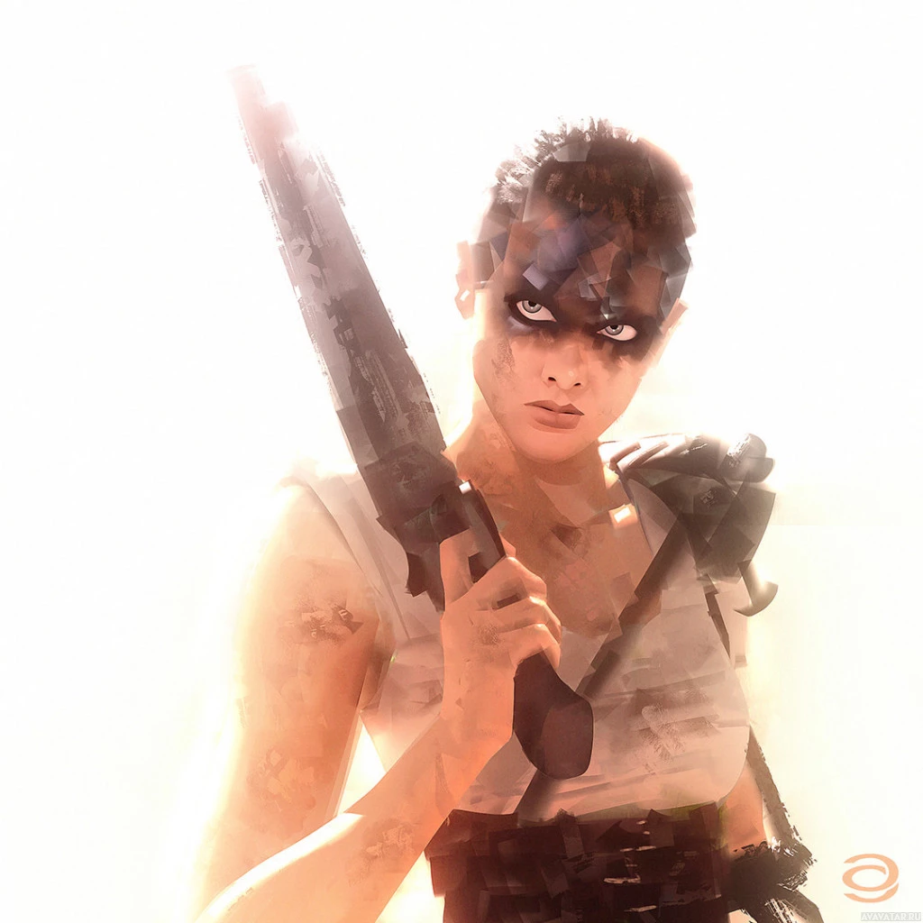 facial expression, holding what appears to be a rifle or some kind of weapon, and has a rugged, battle-worn appearance. She is dressed in armor or a uniform that suggests