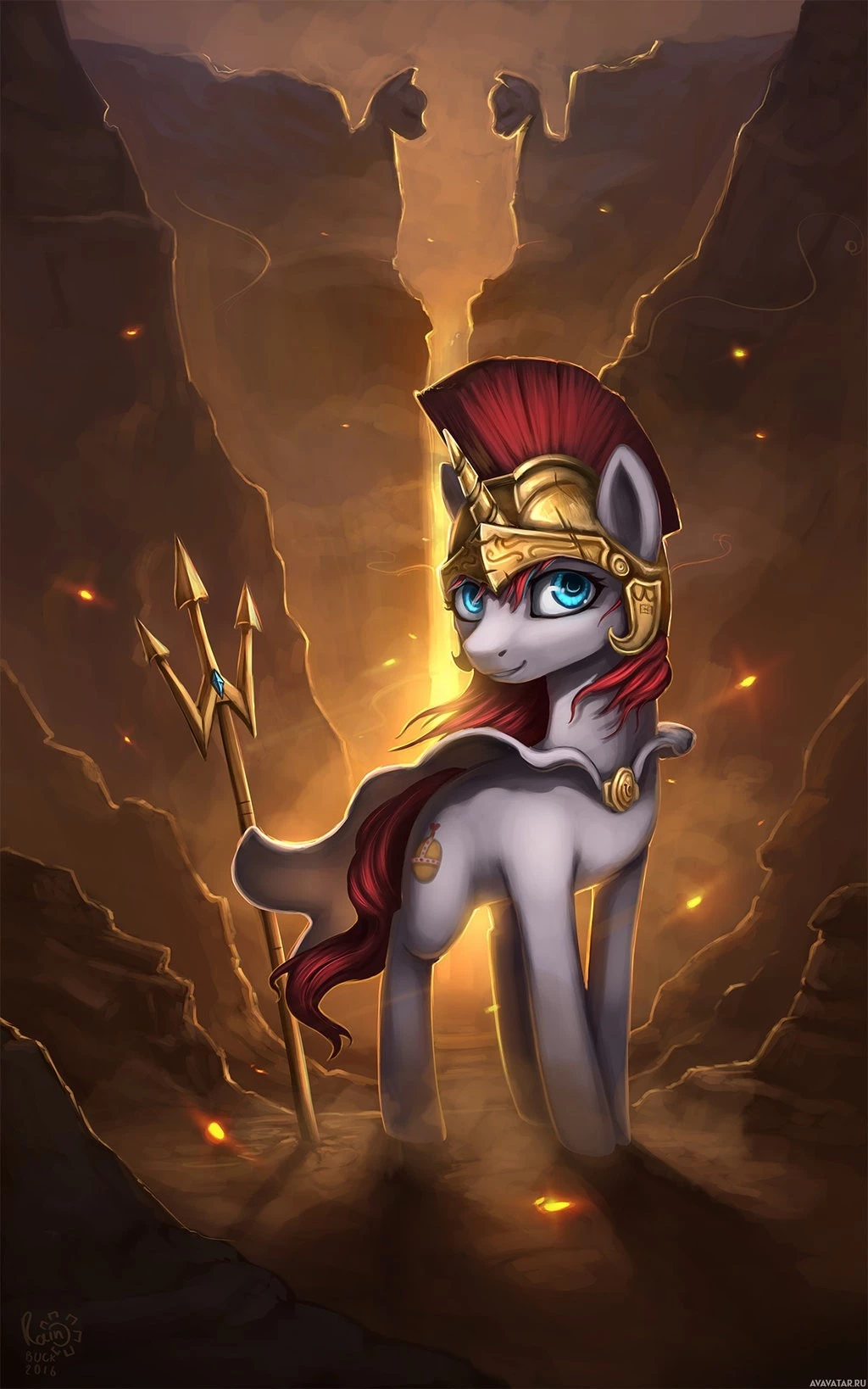 На картинке изображен иллюстрированный персонаж, напоминающий пони, стоящего среди огненной вулканической активности. Пони украшен шлемом и доспехами, которые придают ему облик воина или солдата с древних времен. Кажется, что он находится в разгаре битвы или сталкивается с опасностью, что подсказывает окружающий ад. Этот персонаж, вероятно, из анимационного фильма или сериала.