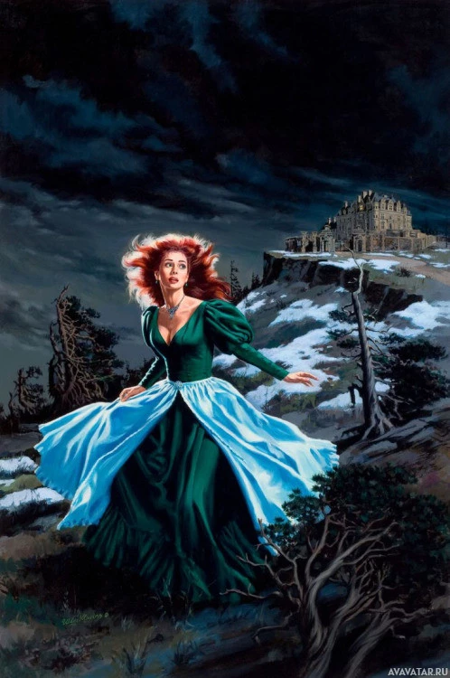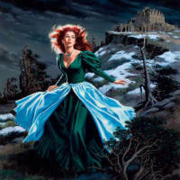 red hair, wearing a long green dress. She appears to be in