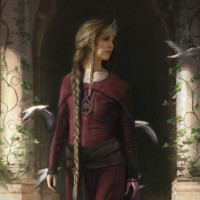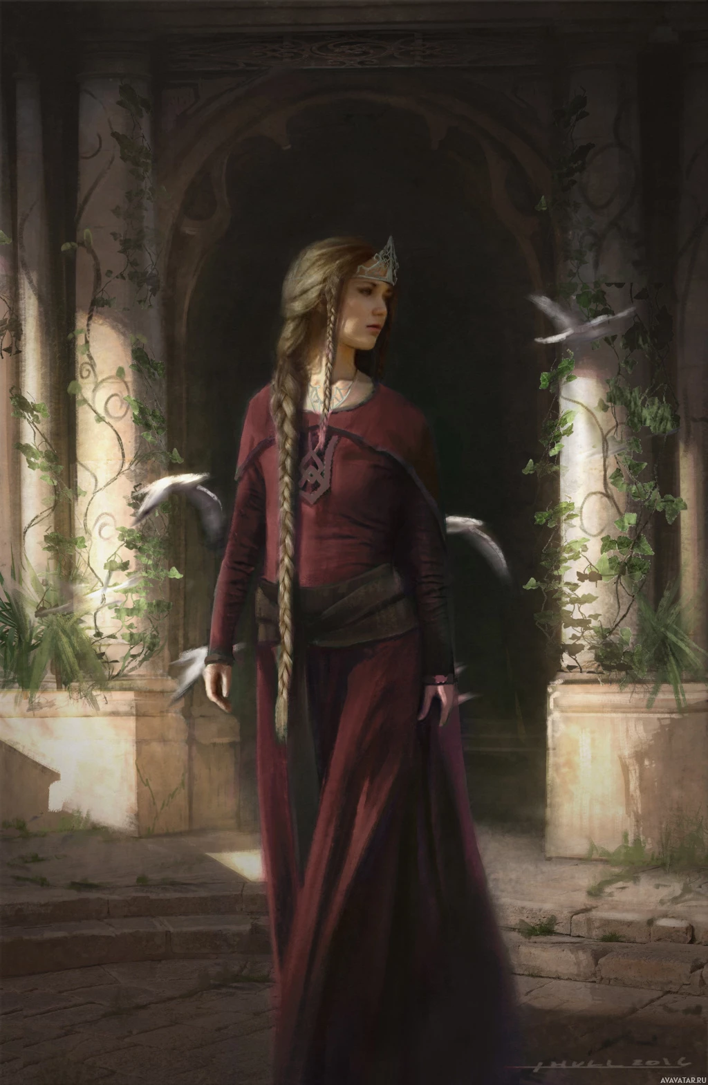 a fantasy setting or a historical period. There are also some elements like vines or greenery at the bottom part of the image, which adds to the overall
