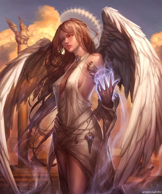 white wings, a halo above her head, and is holding up one hand as if casting magic or summoning power. She has