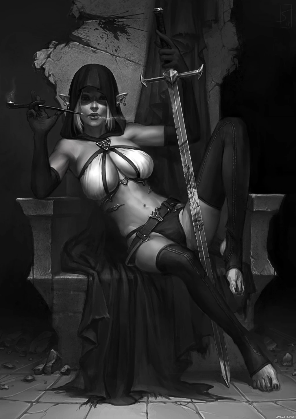 fantasy setting. They are sitting on what looks like a throne made from stone, giving the impression that they may hold some