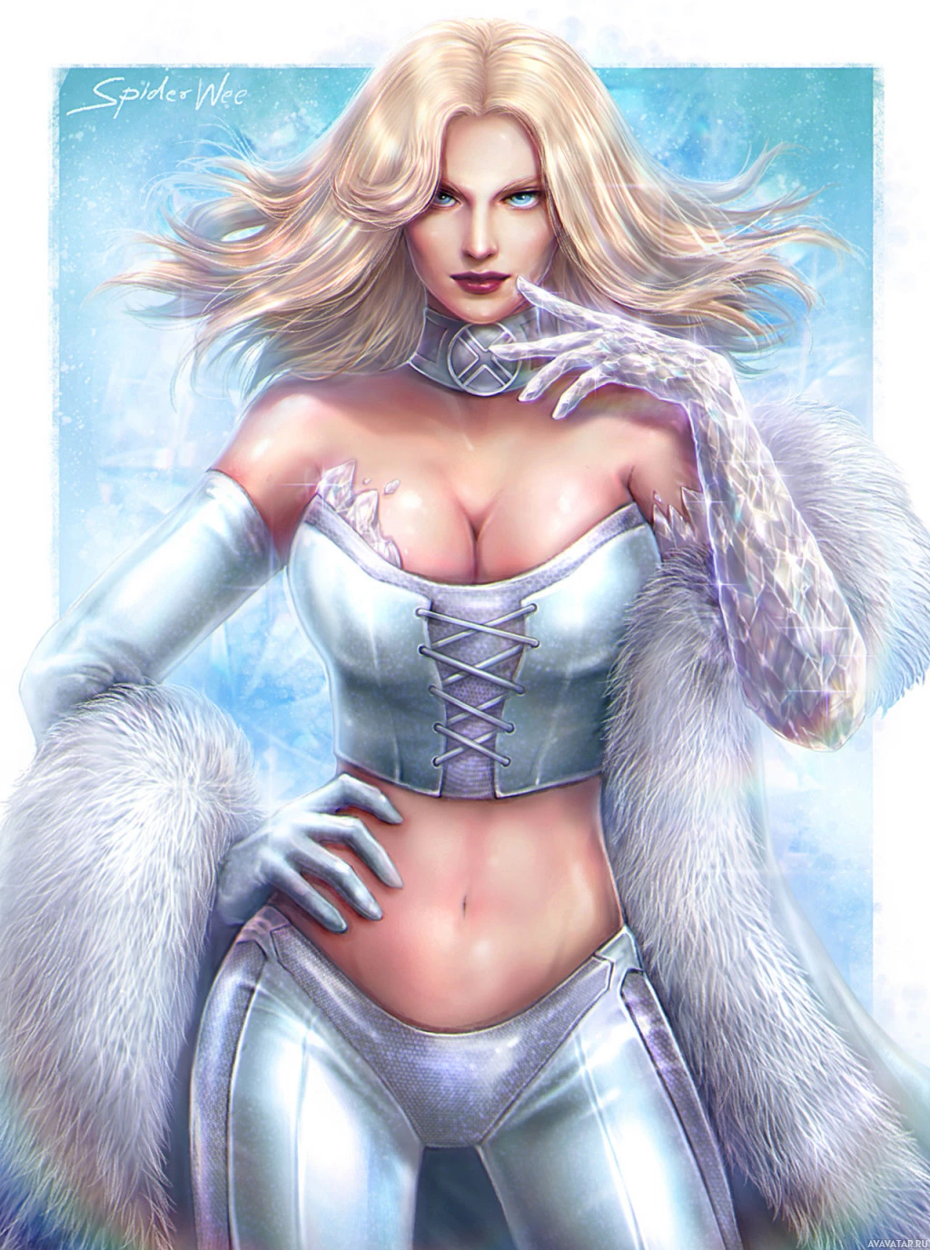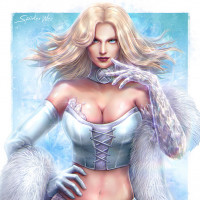 an illustrated character that appears to be inspired by Emma Frost, a well-known character from the X-Men comics. She is depicted in a highly stylized and dynamic pose with her hair flowing behind her, suggesting movement or speed. She's wearing a sleek, form-fitting suit with
