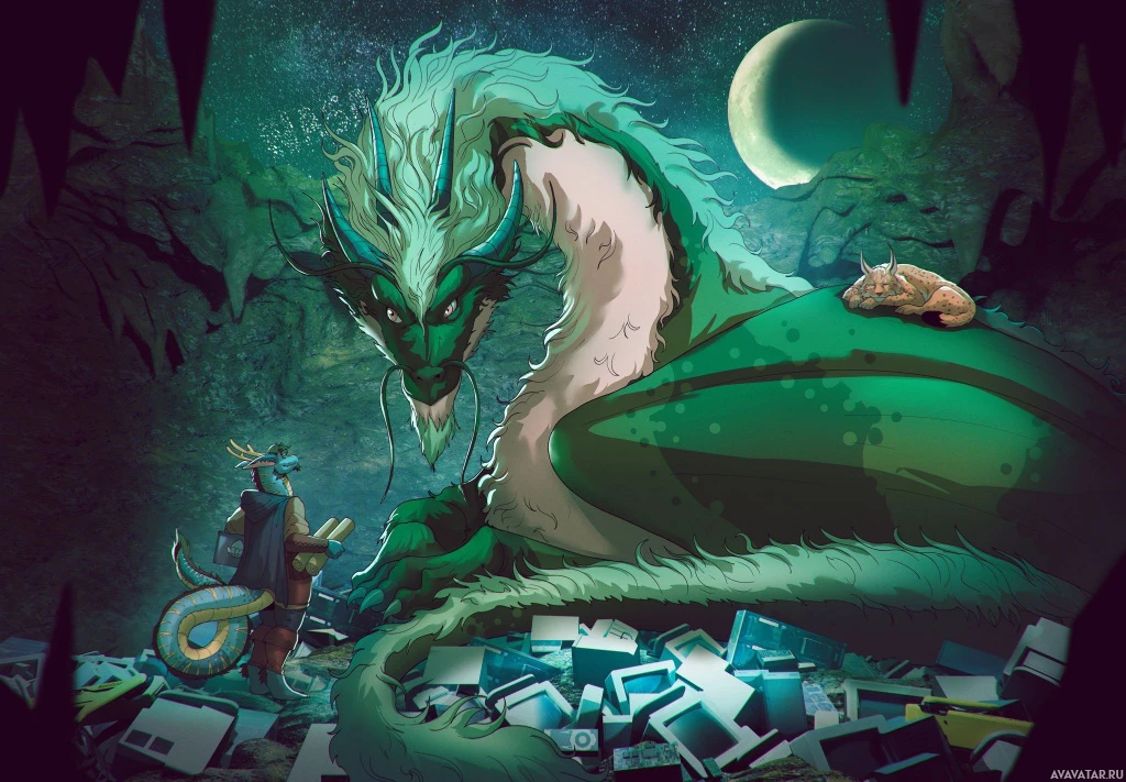sharp teeth visible and its eyes are open wide. The person standing nearby seems to be equipped for combat, possibly a warrior or adventurer, as they're wearing armor with a shield. The setting is dark and appears to be nighttime, enhancing the mystical or otherworldly atmosphere of the image. The presence of the moon adds to