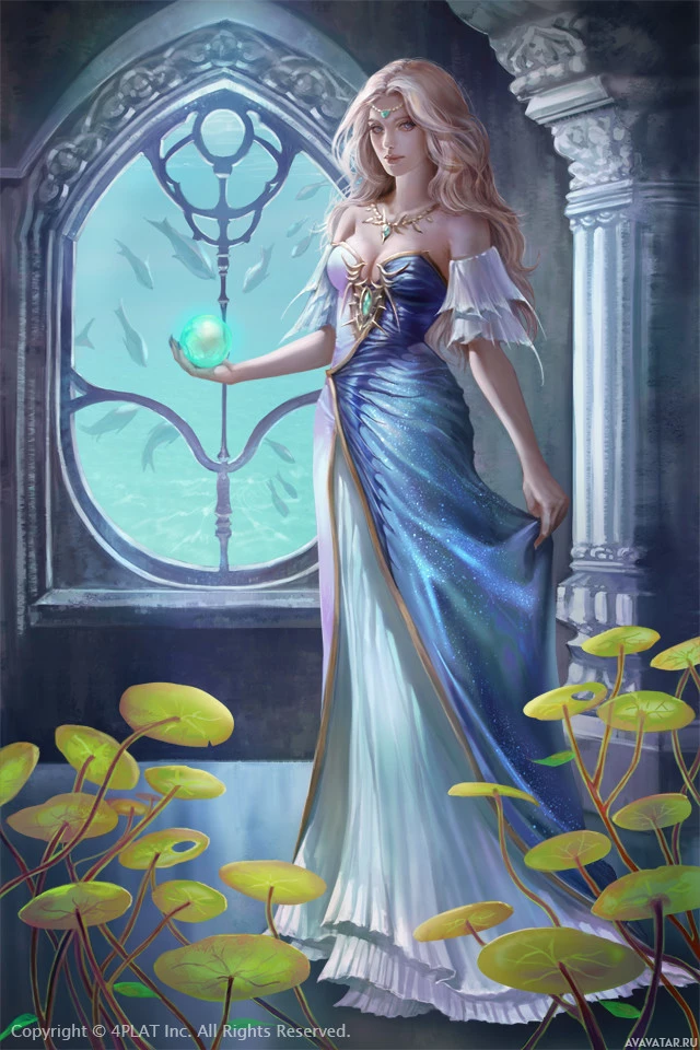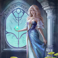 blonde hair, dressed in elaborate clothing that suggests she might be a magical being or has some special status within her world. Her pose and expression convey a sense of grace and