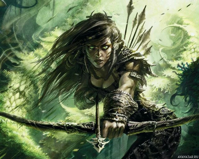 mythical race known for their skills with the bow. Her hair is flowing and she has