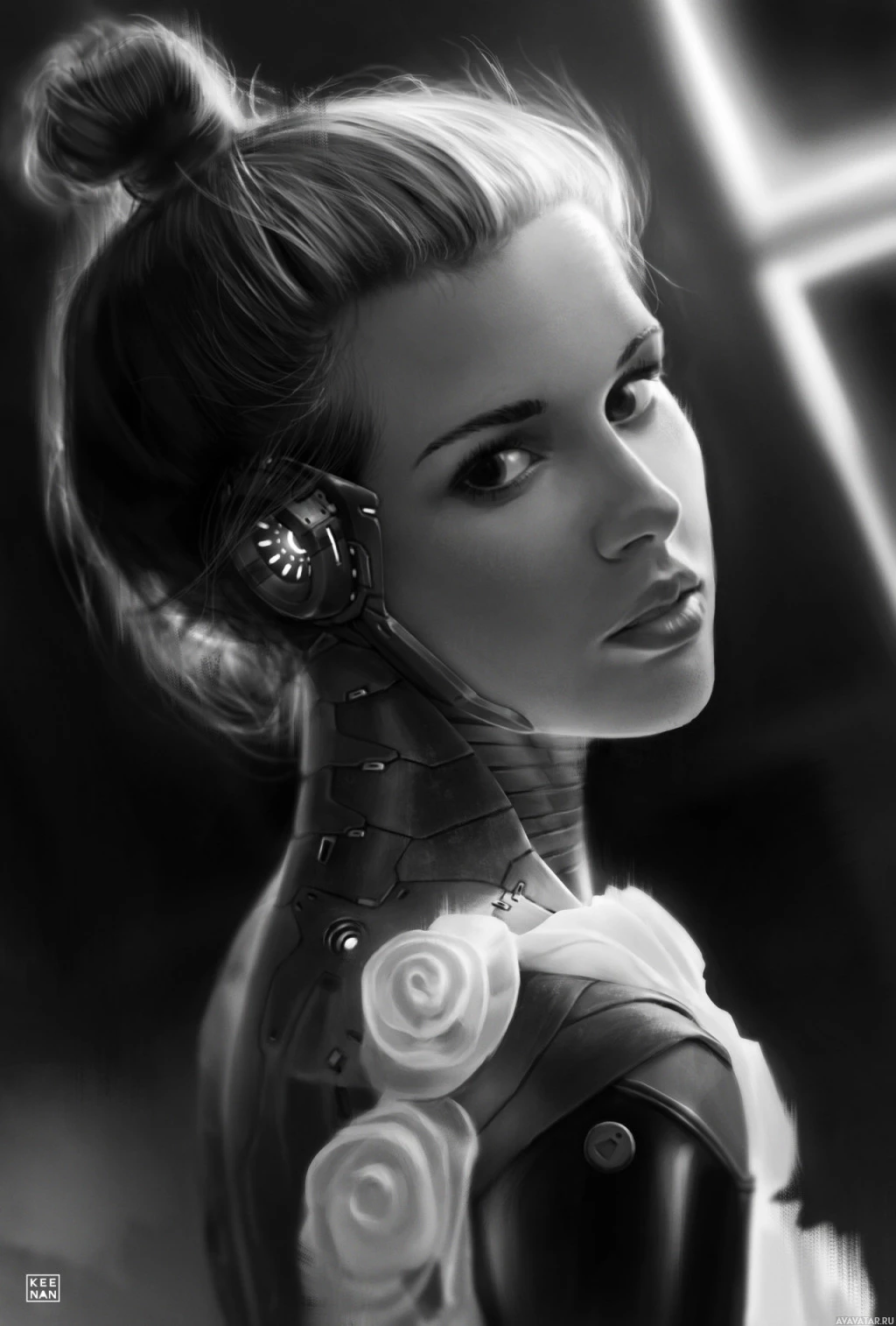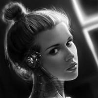 level of detail. Her appearance is blended with elements that suggest she might be a robot or a character with