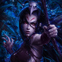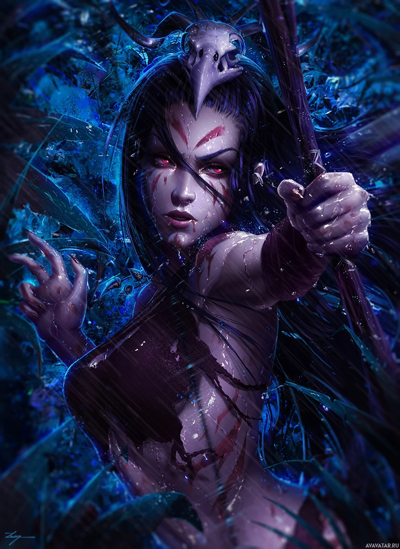 dark hair, pointed ears that suggest she might be an elf or fantasy creature, and her attire includes a top with revealing cutouts. Her expression is intense as she gazes ahead, holding what seems to be a bow or a weapon in her right hand. The artwork captures the ambiance of a mystical, possibly magical, environment with a touch of realism due to the detailed depiction of