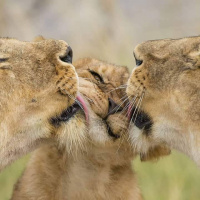 a young adult or subadult in the middle, and there's a cub on the right. They are all engaging in what seems to be social interaction, such as grooming or
