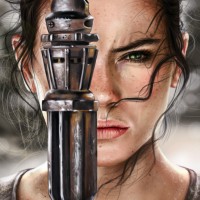 a blaster rifle and appears to be in a determined or intense expression, which aligns with her role as a heroine often associated with action and adventure. Her attire, weaponry, and overall look suggest that she is part of