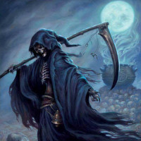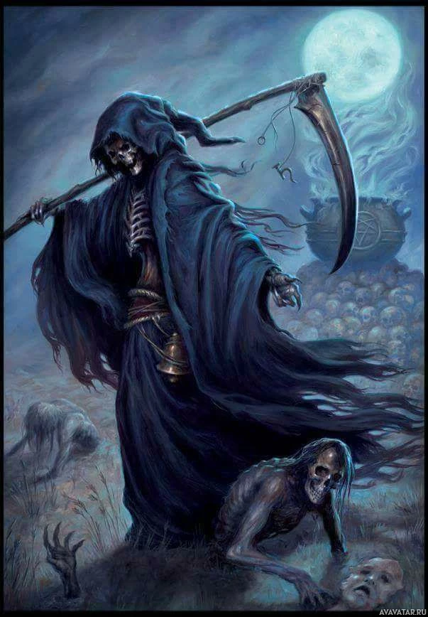 the Grim Reaper, often associated with death and the afterlife in various mythologies. This figure is holding a scythe in one hand and has dark, menacing clothing that adds to its