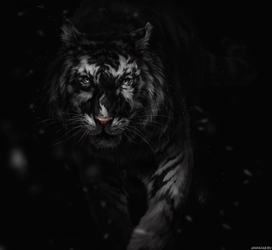 striped fur. The tiger in the picture appears to be walking or possibly running, with its eyes focused forward as if it's on the prowl or patrolling an area. The background is dark, enhancing the intensity of the scene, and there are hints of snow falling, suggesting