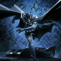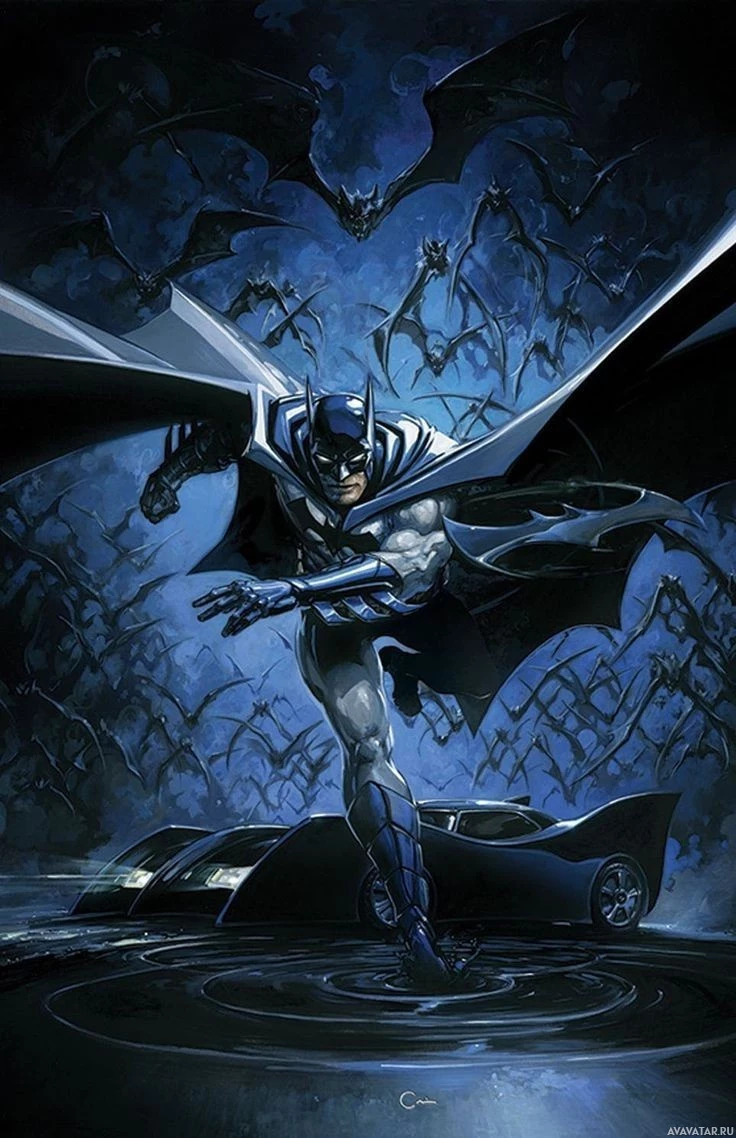 classic costume, which includes a cowl, cape, and emblem on his chest. The artwork showcases a dramatic and moody atmosphere, typical of