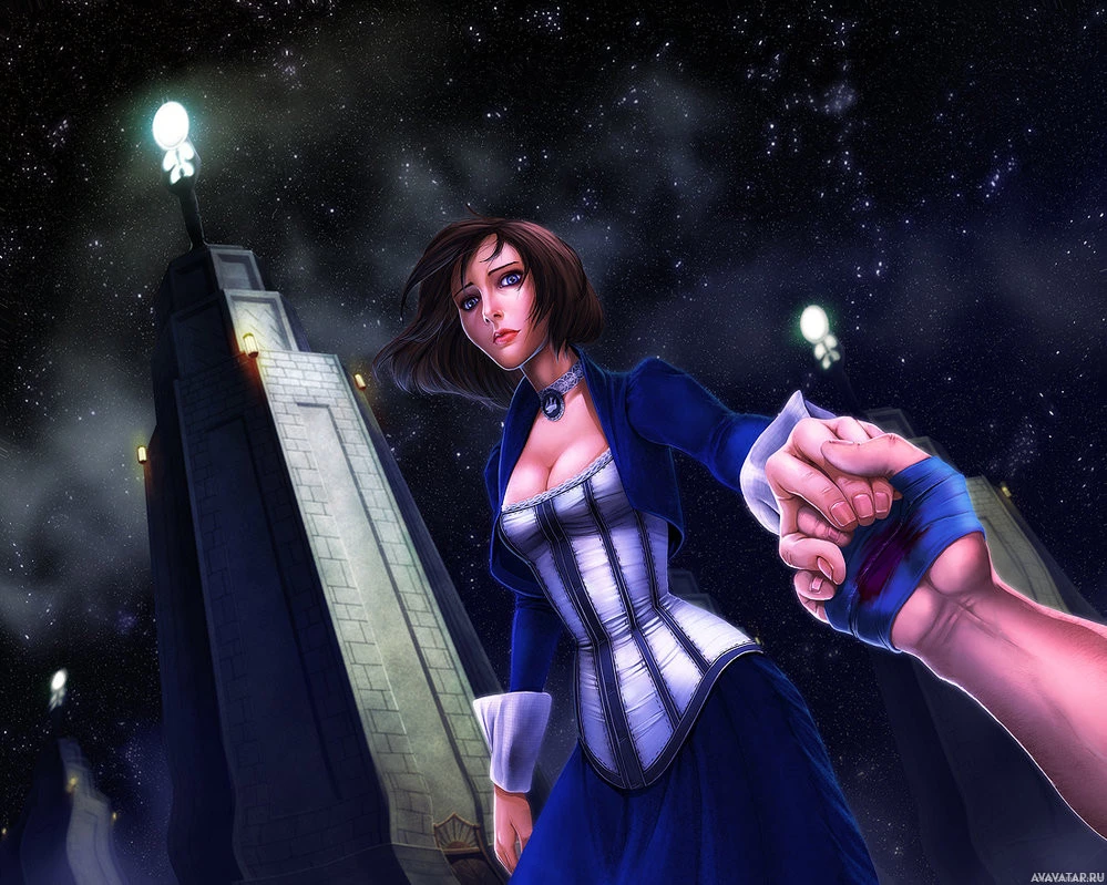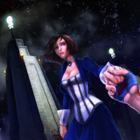 the video game Bioshock. She is wearing a blue dress and has brown hair, with a serious expression on her face as she looks upward at