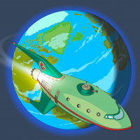 television series "Futurama," which features various adventures across time and space. The illustration shows the spacecraft flying through space with Earth visible in the background, highlighting the interstellar theme of the show.