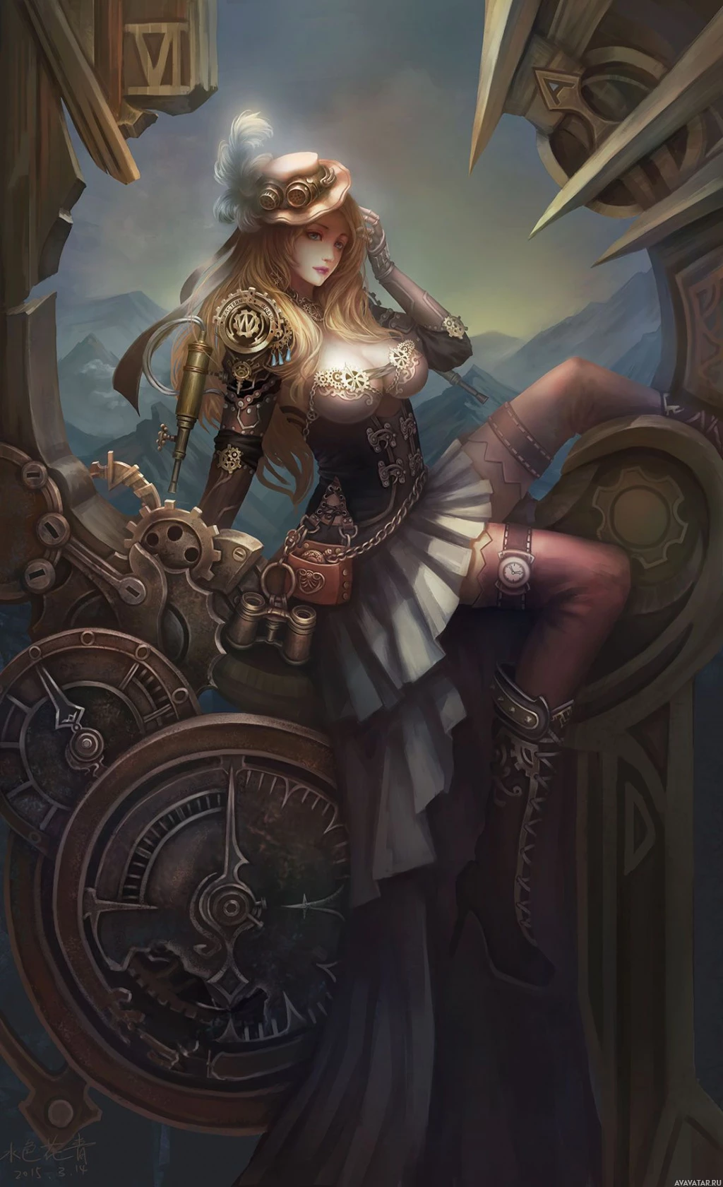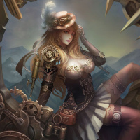 a female character with blonde hair, wearing a hat. She is depicted in a fantasy or steampunk setting, holding a large clock gear as if it's a weapon or tool. She has a mechanical or industrial design to her clothing and accessories, which suggests she might be a character from a story set in