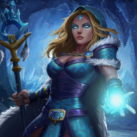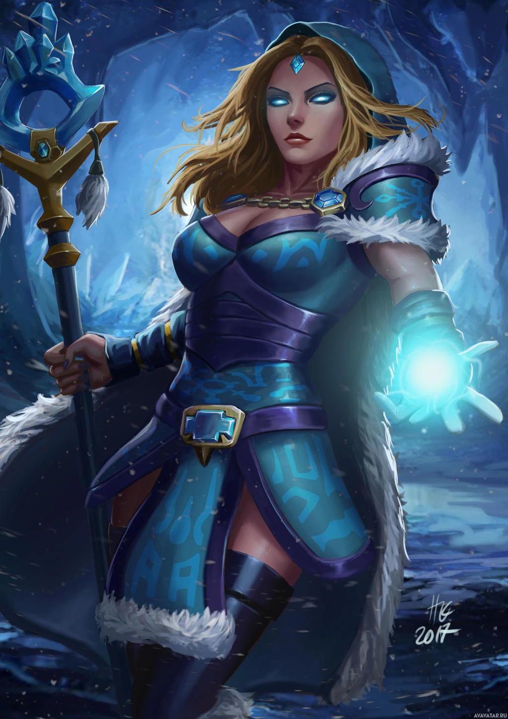 Crystal Maiden. She is depicted wearing armor with blue and white elements, including fur trim on her sleeves, and she wields a staff that emits a glowing