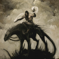 a fantasy scene with a rider on a creature that resembles a dragon or a mythical beast. The rider is holding what appears to be a staff or wand and is perched high on the back of the creature, suggesting they might have