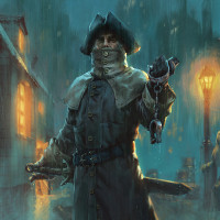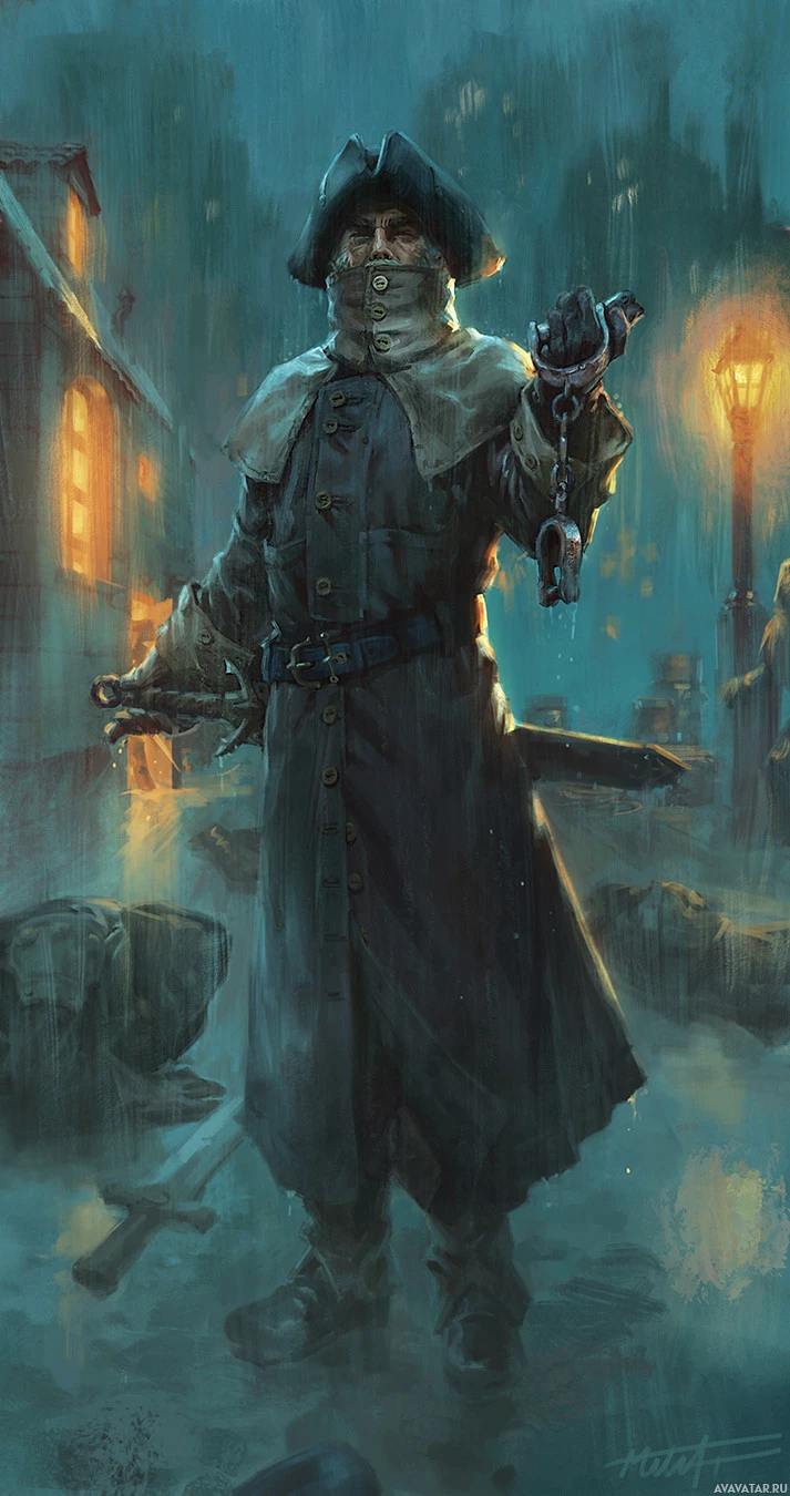 a dangerous situation. In his left hand, he holds a cutlass, while his right hand is raised, possibly indicating that he's either drawing his weapon or making a gesture to communicate with others. The setting appears to be a darkened street at night with a hint of mist, adding to